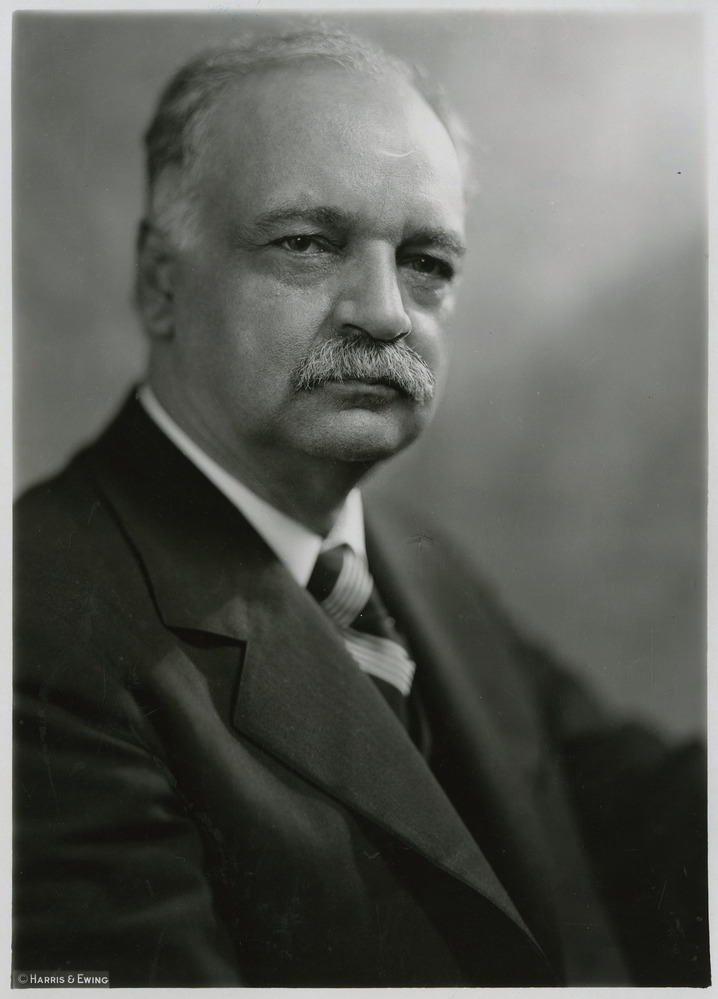 A 1928 bust portrait photo shows a serious gray haired and mustached man in a suit.