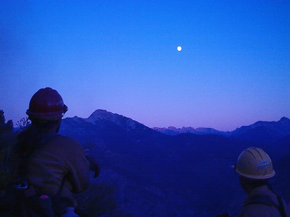 The North Fire was ignited by lightning on August 21, 2004, and was discovered the next day by a park fire engine crew stationed in nearby Cedar Grove. After three days of burning, the fire was showing potential to spread downslope toward the Cedar Grove development in the bottom of Kings Canyon, so containment action was taken along the west flank of fire to control that downslope movement. A total of four acres burned. These images, taken by SEKI Fire Monitoring Crew, show vegetation before, during and after the burn and views of sundown and moonrise over the Great Western Divide.