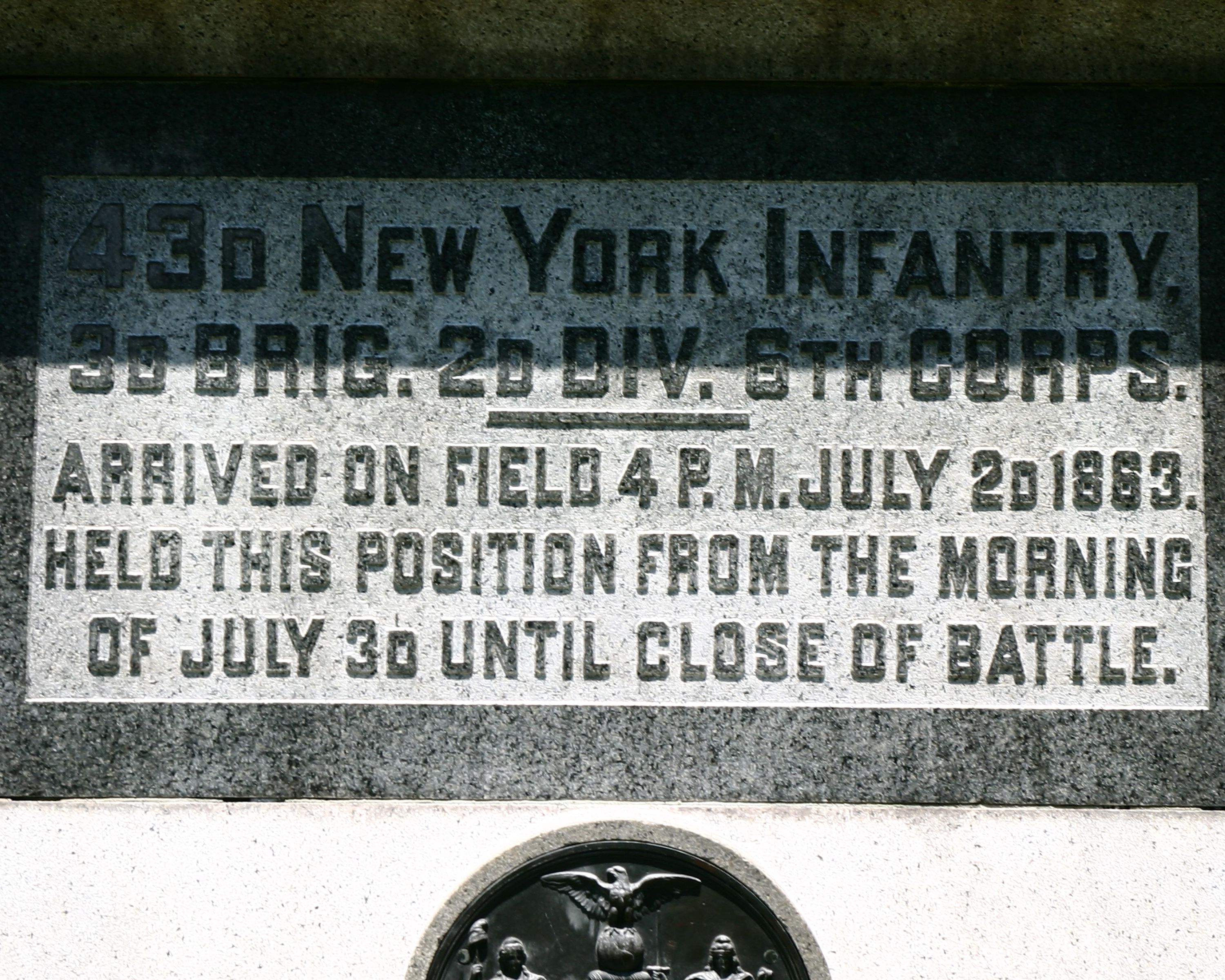 1 of 90 Monuments to New York. Indicates position occupied as a reserve unit July 3-5, 1863. LF&RF markers located N-S of Mn. Monument located on Neill Avenue. || Mn & 2 flank markers. Mn base 9'x6'3" rough cut, tooled edge, chamferred top. 2 part shaft, 1st smooth cut w/bronze medallion, 2nd polished face/excised inscription, bronze Corps symbols. Hipped cap w/bronze trophy. All 7'9"H. Markers 1 cu.ft.