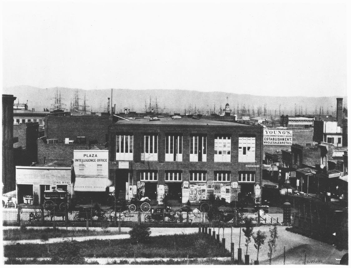 Stage Office, Plaza Intelligence Office, Golden State Bakery, and Job Printing Office in view. Advertisement in view for "Young's Cloak, Bonnet & Fancy Goods Establishment. Wholesale & Retail." Shipping visible in the distance. Photo appears in the book "San Francisco Album" which contains views photographed by George R. Fardon circa 1856. Plate 4. Published in 1859 by Herre and Bauer in San Francisco, CA.