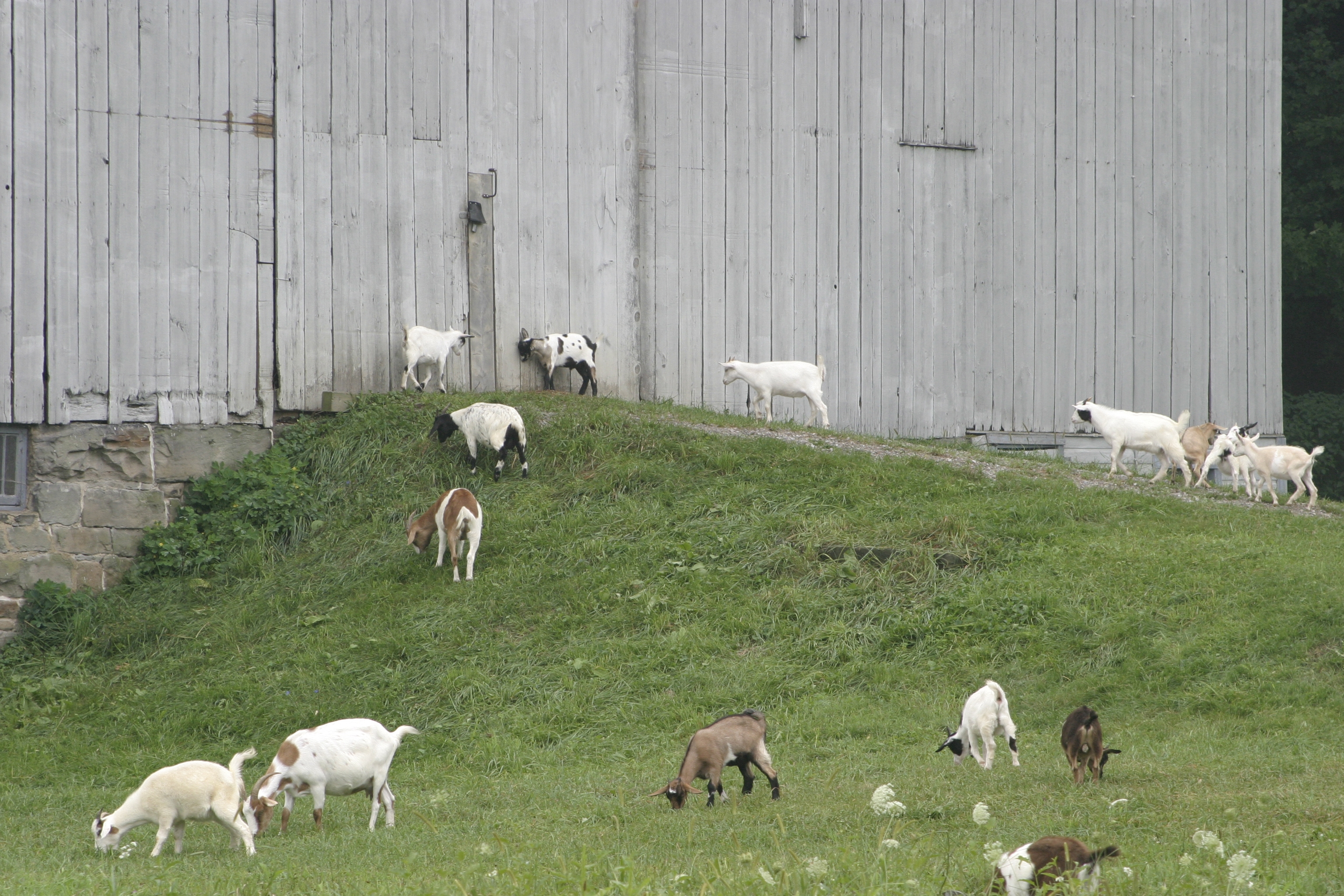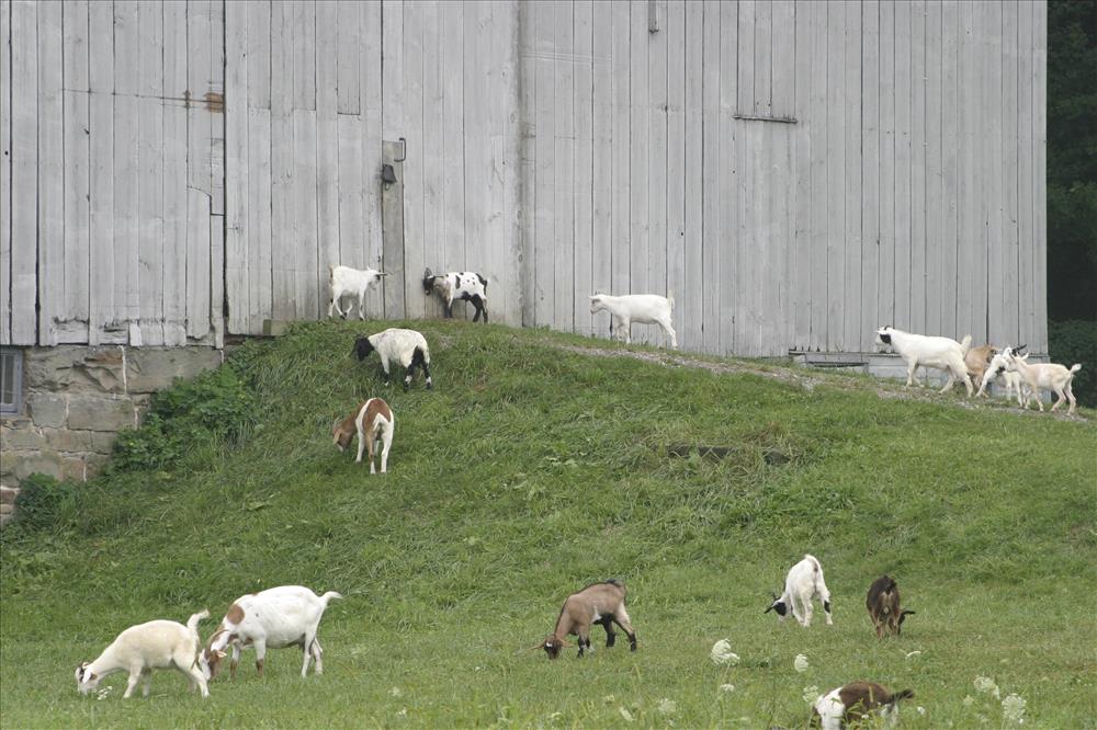 Fainting goats being raised for meat are pastured near the barn at Goatfeather Point. || Goatfeathers Point is one of eight farms in Cuyahoga Valley National Park's Countryside Initiative. This program invites farmers to live and farm in the park using sustainable methods that do not adversely affect resources. At Goatfeathers Point, the Bechter-Smith family sells humanely raised, pastured meat goats and heritage-breed turkeys and chickens.