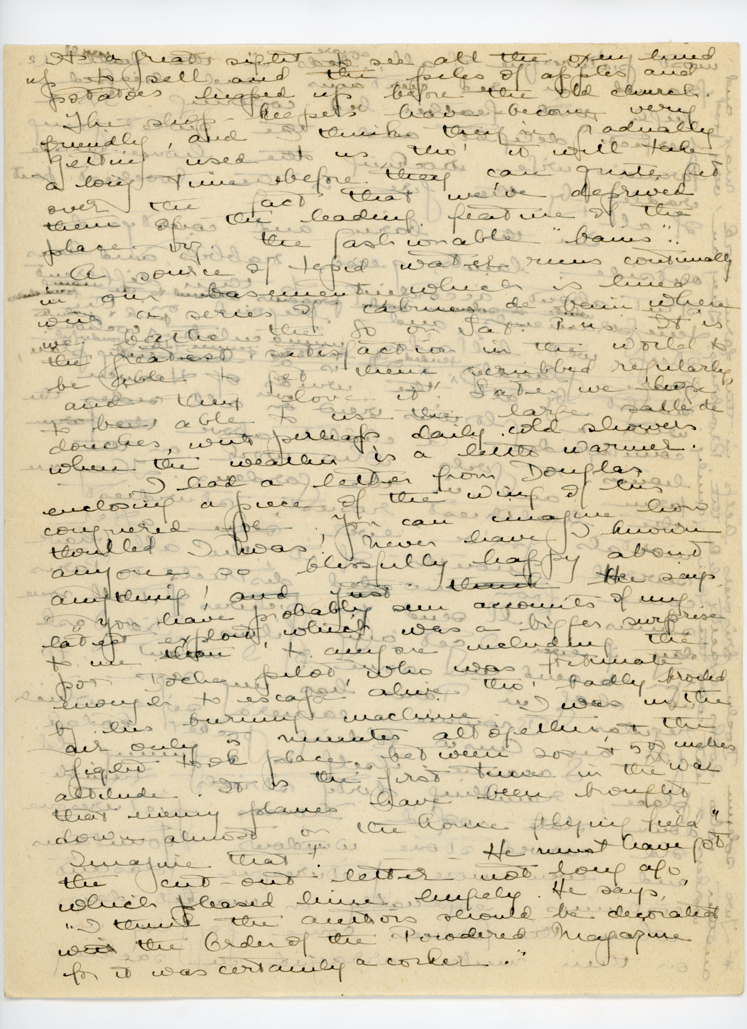 [page 5] I had a letter from Douglas enclosing a piece of the wing of his conquered foe; you can imagine how thrilled I was! Never have I known anyone so blissfully happy about anything! [crossed out: and just think] He says you have probably seen accounts of my latest exploit, which was a bigger surprise to me than to anyone including the poor Boche pilot, who was fortunate enough to escape alive tho’ badly broiled by his burning machine. I was in the air only 5 minutes altogether, & the fight took place between 200 & 500 metres altitude. It is the first time in the war that evening planes have been brought down almost on the home flying field.” Imagine that! — — He must have got the cut-out letter not long ago, which pleased him hugely. He says, “I think the authors should be decorated with the Order of the Powdered Magazine for it was certainly a corker.”