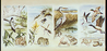 These include an Upland scene with a White poplar, Beach plum, Bayberry, a Cottontail rabbit, Tent caterpillars, and a Mockingbird in flight, and a White Poplar tree; a Dune scene portion depicts American beach grass(smooth cordgrass), Seaside goldenrod, White-footed deer mouse, Sand wasp, and a fly; the Marsh scene portion depicts a Great blue heron, Spartina grasses (Common reed), Fiddler crab, Common oysters, and a Striped bass; The Tidal Bay scene portion depicts a Skimmer in flight, Herring gulls, a Mallard duck in flight, a Brant goose in flight, Calico crab, and Soft-shell clams