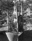 Ta-buce- (Maggie Howard) filling Chucka with acorns. Note: She stands inside to line chucka and place the acorns. Chucka is thatched later.