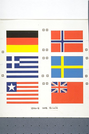 Six of the most frequently seen national flags displayed on commercial ships in Baltimore Harbor today (1988): Germany, Greece, Liberia, Norway, Sweden, and United Kingdom or Great Britain.