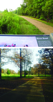 Figure 15. Photographs showing the muted topography of the landscape. Top photograph shows the Green River Road going over a gentle rise with a park sign in the foreground describing a sword clash that took place there. The bottom photograph shows the road bending across the open area of the battlefield with a few flanking trees. Caption follows.