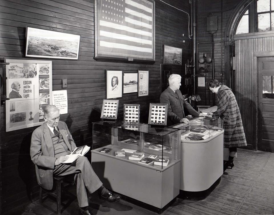 Photo date unknown. This photo depicts early park rangers at a gift counter within Building 5 of the park.