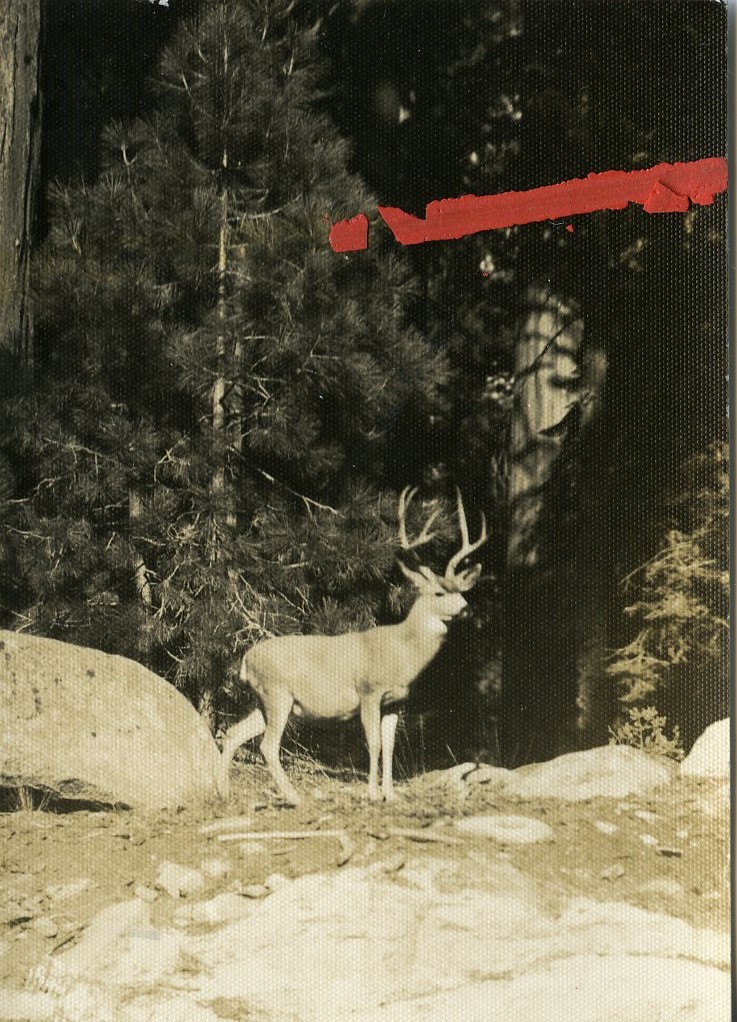 California mule deer , Big buck (sherman tree) looking, Sequoia National Park, 1937 October 14, Negative Number 3-1-3-118 [Close-up], [Prints-Box 7, Deer], [Red line across top of print - conservation needed],