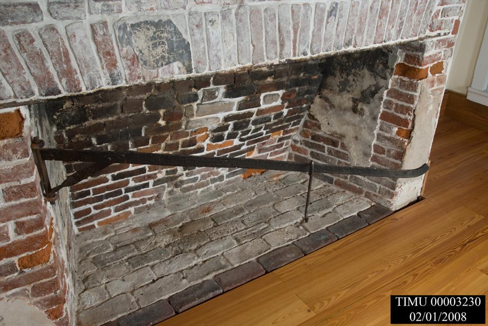 Swival fireplace crane used to hang pots from for cooking and various household<CRpurposes. Long metal arm narrows and curves upward toward the right-side end;left-side end<CRof arm forged at a right angle to the top of a short metal bar; a third bar forms an angle<CRd brace, forged at one end to the bottom of the short bar, and attached by fasteners at it<CRs opposite end to the arm. The short bar has rounded ends which swivel between 2 rings att<CRached vertically to the left side of the fireplace, making a swivel fireplace crane.