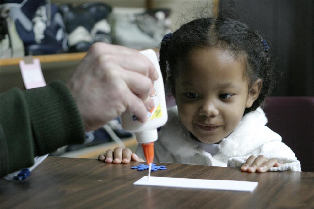 Children make crafts with Park Ranger Paul Motts inside the Winter Sports Shelter. Families enjoy hot drinks. SCA intern provides information to visitors. || During the winter months, the Kendall Lake Shelter becomes CVNP's Winter Sports Center. Services include cross-country ski and snowshoe rentals and winter recreation programs.