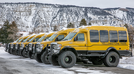 Seven yellow vans with large, low pressure tires are parked next to each other.