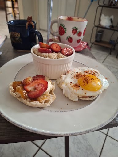 A bowl of oatmeal with strawberries, one English muffin with strawberries and jam, the other with an over-easy egg, and two mugs