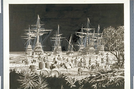 Hernando de Soto's expedition in the process of disembarking. Illustration depicts some members in transit and some already ashore.