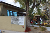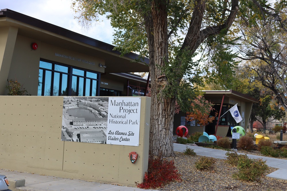 A tan single-story building with a black and white sign that reads, "Manhattan Project National Historical Park: Los Alamos Site Visitor Center.” In front, a small manicured courtyard with a large tree and a white flag with a blue “i” signaling information available here.