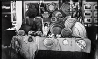 Sales photo of baskets at Salter's store, Yosemite. #6 & 10 by Lucy Telles, now at Field Museum of Natural History, Chicago. #25, 29, 35 also by Lucy Telles. #25 in YNP Collection.