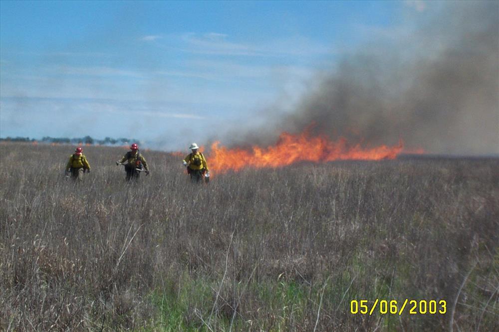 Depicts a prescribed grasslands burn at Fort Larned National Historic Site, May 2003.