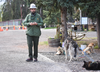 A ranger talks to the crowd after concluding a demonstration run with sled dogs