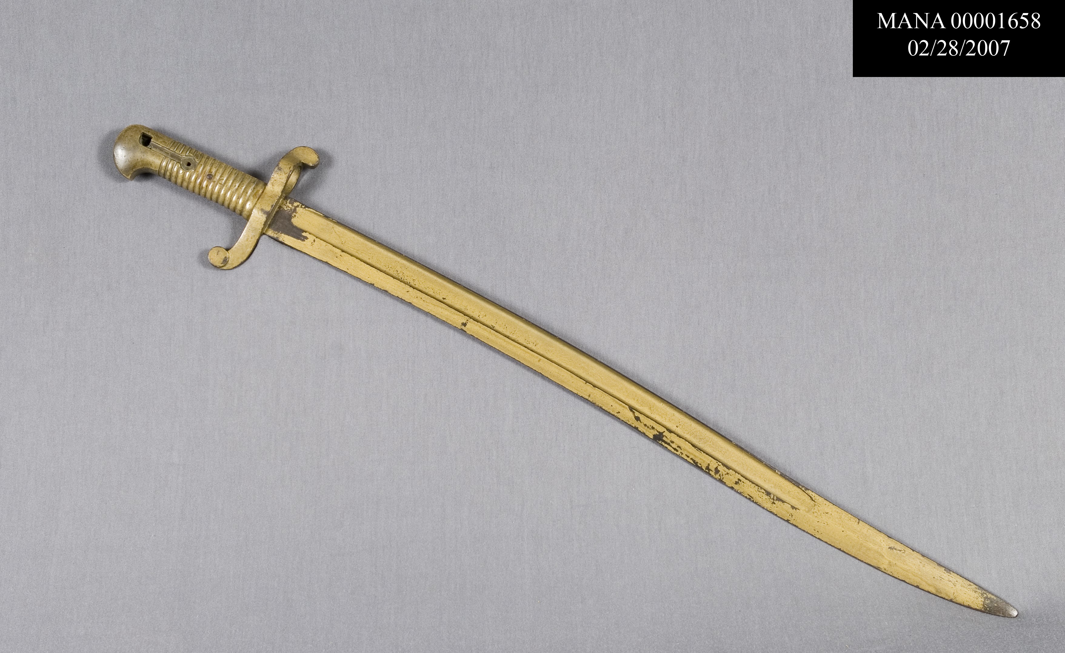 SWORD BAYONET PATTERNED ON FRENCH M1842 SHORT RIFLE (CARABINE) BAYONET. 22.6" YATAGHAN BLADE (TIP ROUNDED); S-SHAPED IRON GUARD WITH .91" BORE; RIBBED BRASS GRIP MARKED: 1386 (IN CATCH SPRING MORTISE); LOCKING PARTS MISSING. IRON HILT RIVET AT 8TH RIB FROM GUARD; GUARD & BLADE PAINTED GOLD.