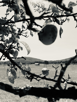 Through the spiky branches and plump fruits of the apple tree lies a landscape with rolling hills of the forests and an elegant barn at the center.