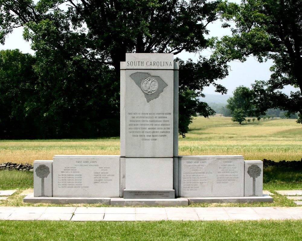Commemorates South Carolina troops who fought with CS army in Battle of Gettysburg. Occupies ground where Kershaw's South Carolina brigade had massed on July 2 & 3 1863. Located on Section 4, Confederate Ave. || Monoliths, 5'5"x2'6", on base 3'9" wide, 23' long. Overall 14'2" high. Cut inscriptions on E & W. Outline of State, State seal, narration & listing of SC regiments on E. Carving of SC flag & CS flag & State commissioners on W. 2 marble benches.