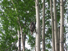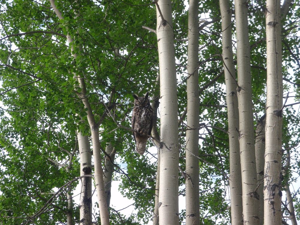 A great horned owl perched in an aspen tree