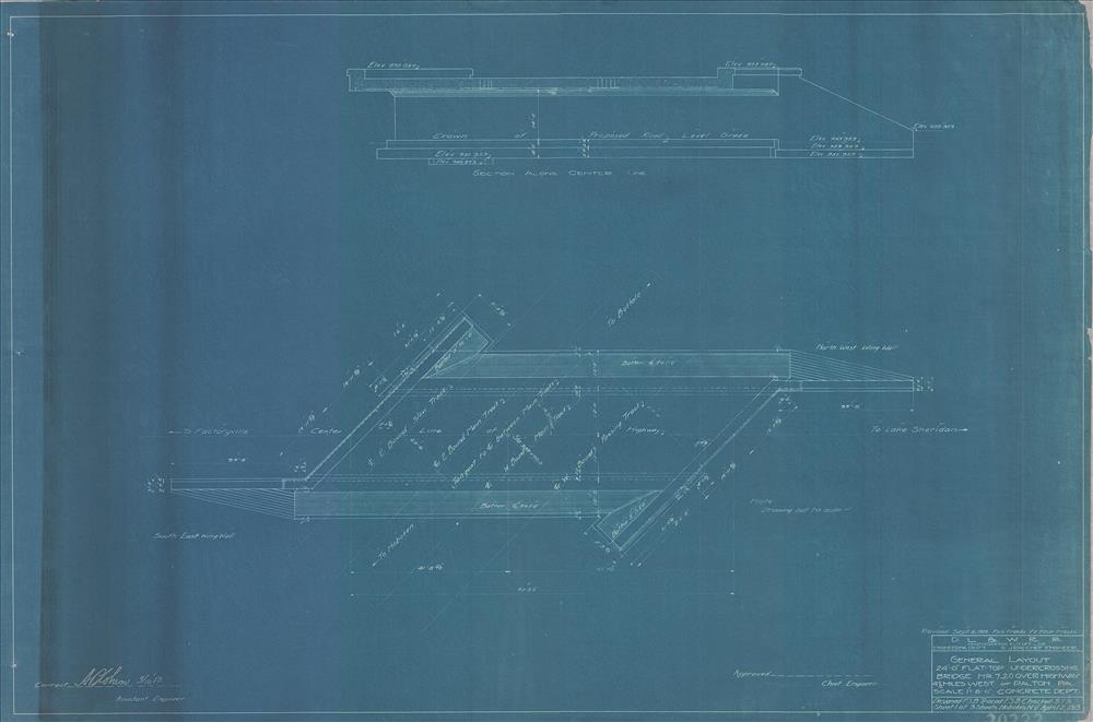 24-foot flat-top undercrossing bridge no. 7.20 over highway--General layout--4.5 miles west of Dalton, PA [1913.04.02] Martins Creek Cut-Off line--Concrete Department--Sheet no. 1 of 3