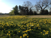 Clusters of daffodils with long green leaves and yellow flowers bloom across a flat area, with leafless trees in the distance.