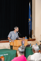 A tall white park ranger with short dark hair stands behind a wooden lectern speaking into a microphone. The lectern is in front of a wooden stage with an American flag resting on it.