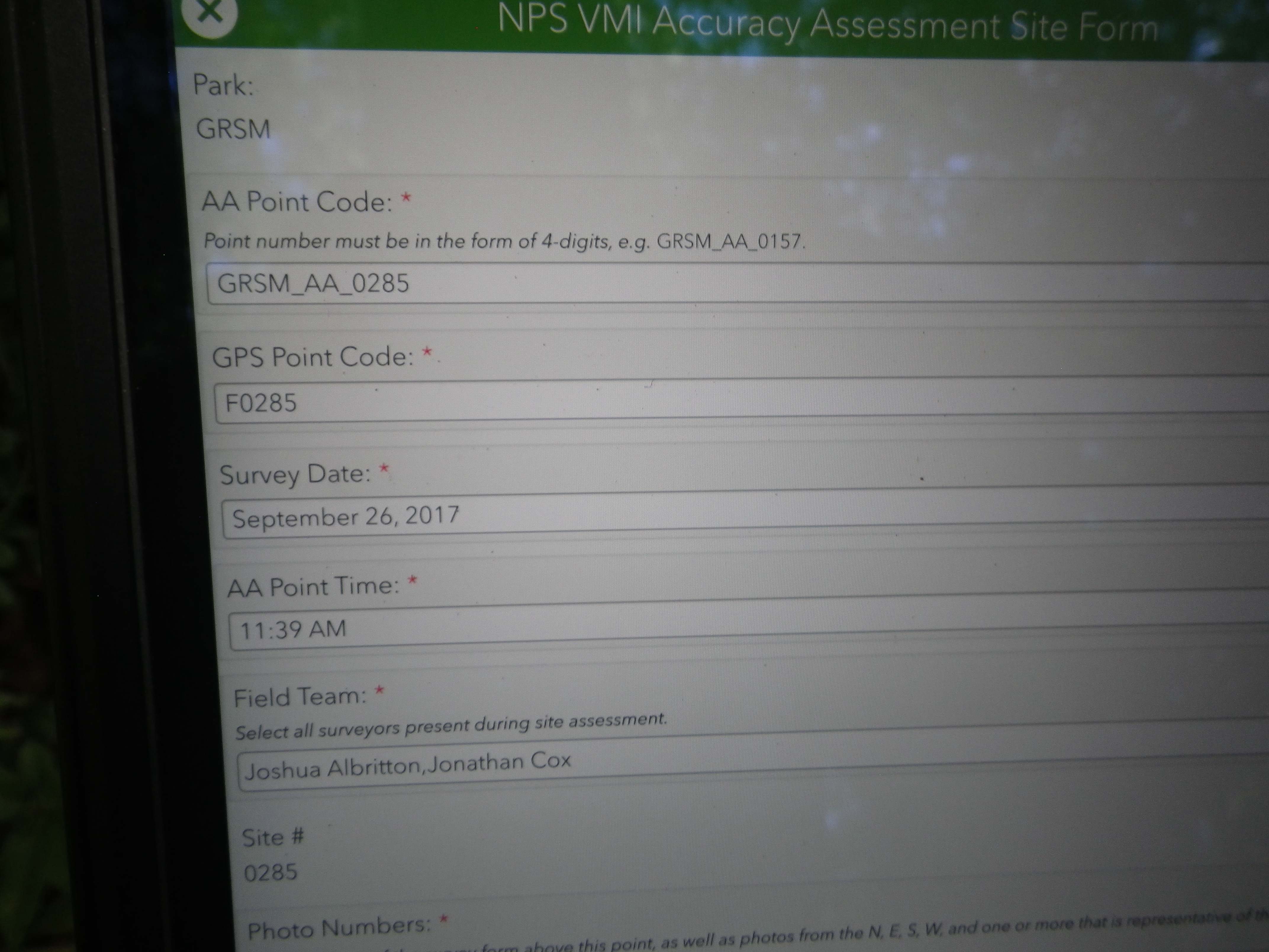 Plot Code: GRSM_AA_0285_1 from the Great Smoky Mountains National Park (GRSM) Accuracy Assessment.