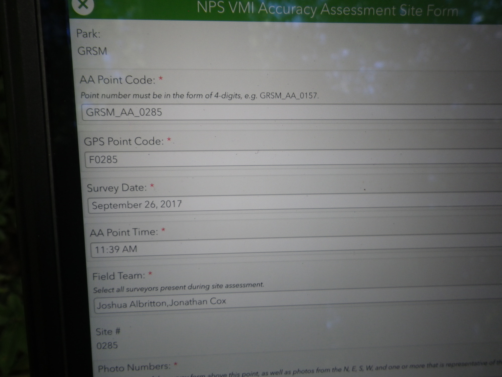 GRSM Accuracy Assessment. Plot Code: GRSM_AA_0285_1