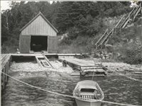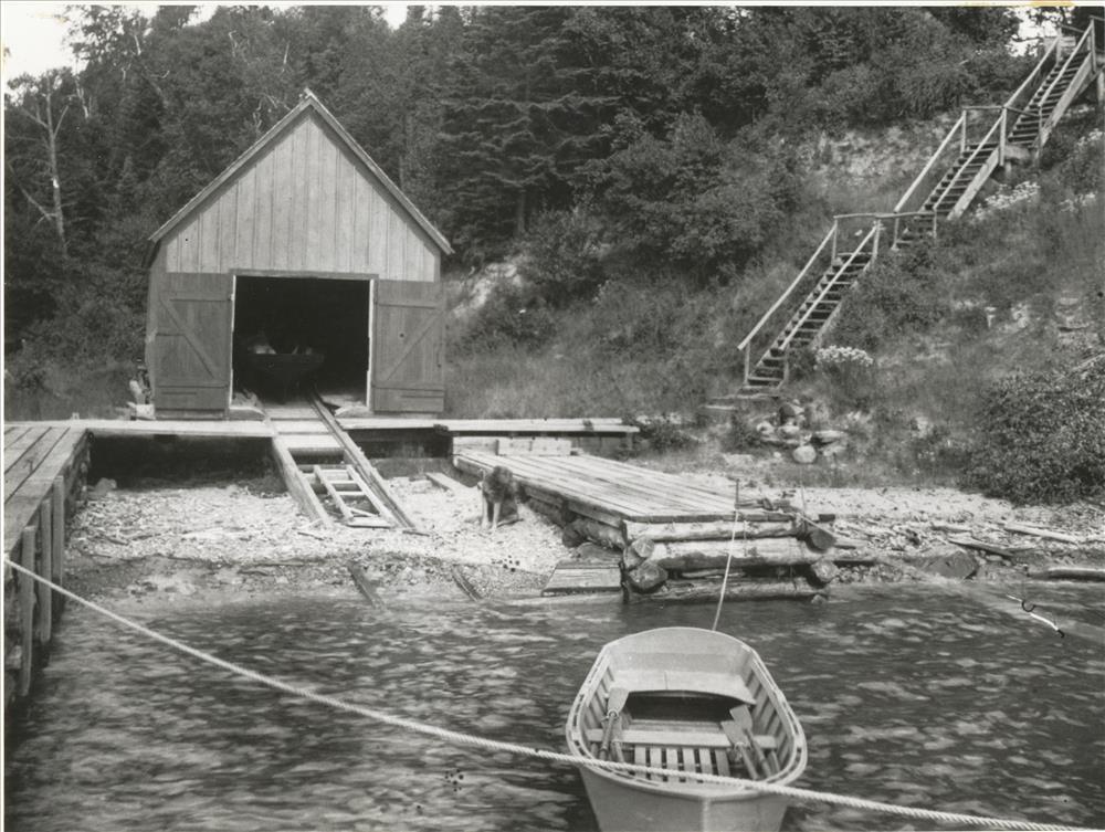 The boathouse was raised up and all deteriorated foundation material was replaced or like new Material was spliced into the old. Floor joist were also replaced or spliced. The grounds the north of the boathouse was contoured to prevent runoff from compromising the building. The doors and windows were repaired. The exterior was painted.