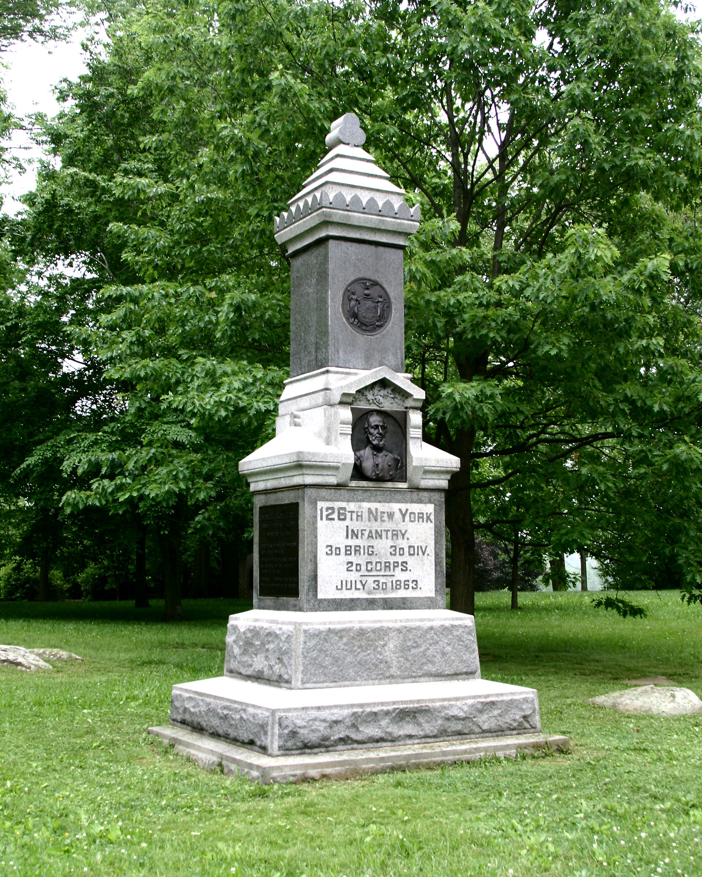 1 of 90 Monuments to New York. Indicates 126th NY Infty position Jul 3. LF&RF mkrs 66'&75,' respectively, N-S from Mn. Mn located E side Hancock Ave in Ziegler Grove. || Mn & 2 flank markers. Mn: 8'5"x7'5" base, 16'4"H. Stepped base to polished & finished stepped stone shaft, pryamidal cap w/ trefoil finial. Excised inscription, bronze bas-relief, medallion, & tablets. RF&LF markers: 1'sq x 1'10"H