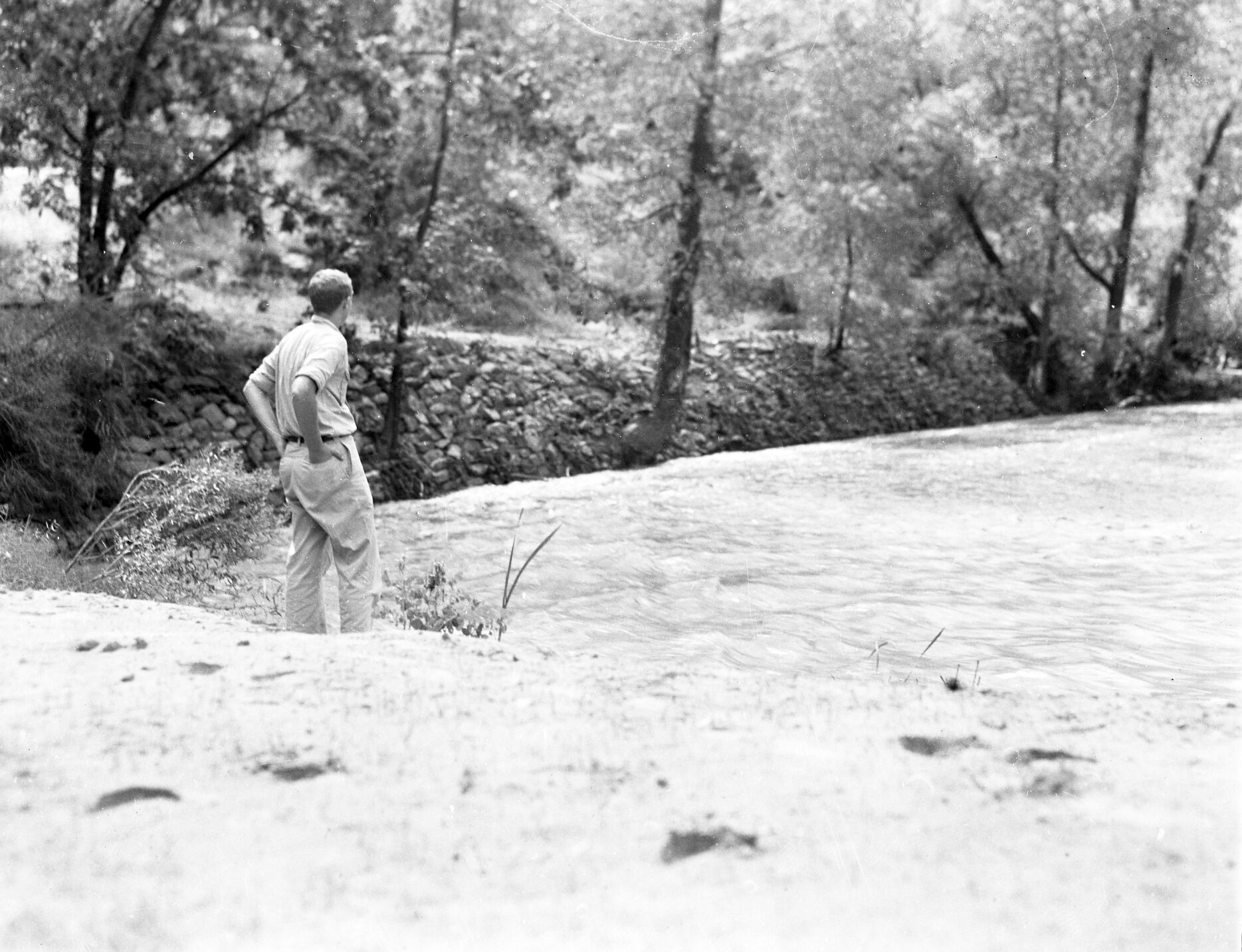 B&W negative of Blue Springs area with person on top of log dam. ; ZION Museum and Archives Image ZION 7144 ; ZION 10061