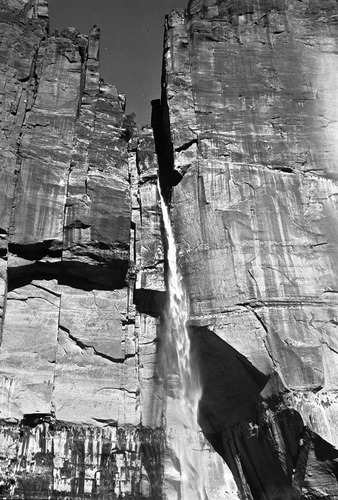 Waterfalls above the Emerald Pools in Heaps Canyon. ; ZION Museum and Archives Image 9021 ; ZION 9021