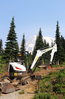 An employee operates an excavator on a dirt trail with Mount Rainier looming in the background.