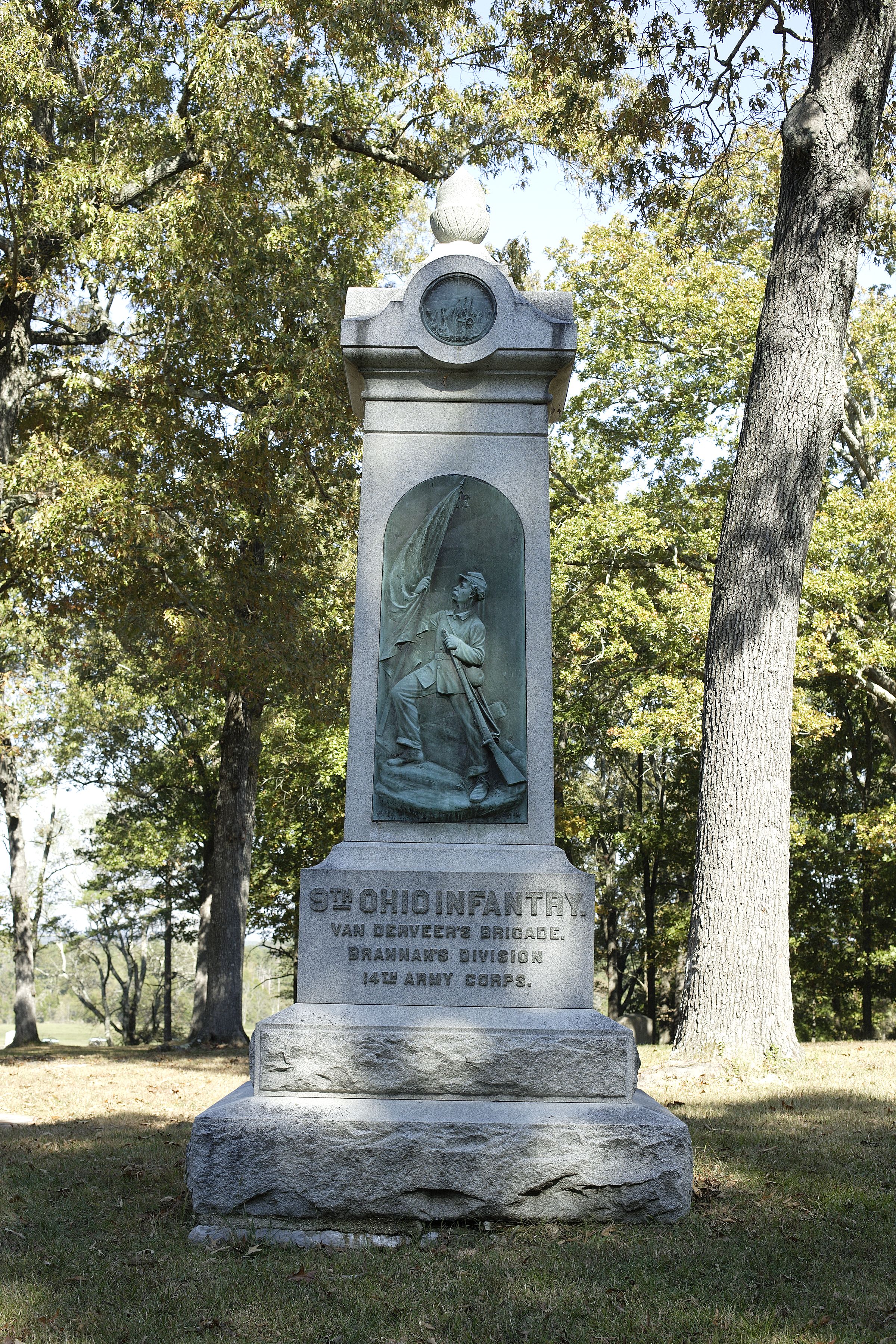 Monument contributes to nat'l significance of park under NR Criterion A because it represents the national movement among veterans & related groups to commemorate Civil War battlefields. || 7' square at base & 17'2" high, monument has 2-step rock-faced base, lettered pedestal, and bronze relief of a color bearer on shaft. Capstone incorporates bronze state seal and supports acorn finial. Located on Snodgrass Hill.
