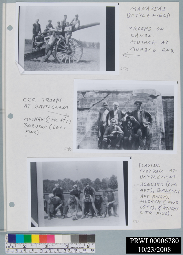 PEOPLE B&W CCC PHOTOS 1936-1941 FROM JOHN BEZUSKO ALBUM<CRCONTENT:CCC TROOPS AT BATTLEMENT. MUSHAKA, BEZUSCO.<CRIDENTIFIER:5 MEN. ONE WITH TOWEL WRAPPED AROUND HEAD.<CR#6703 THRU 6792 ARE FROM SAME ALBUM<CRPHOTOS ARE GLUED TO PHOTO ALBUM PAGES #6703.<CRCATALOG # IS ON PAGE OF SCRAPBOOK. GLOVES FOR HANDLING.
