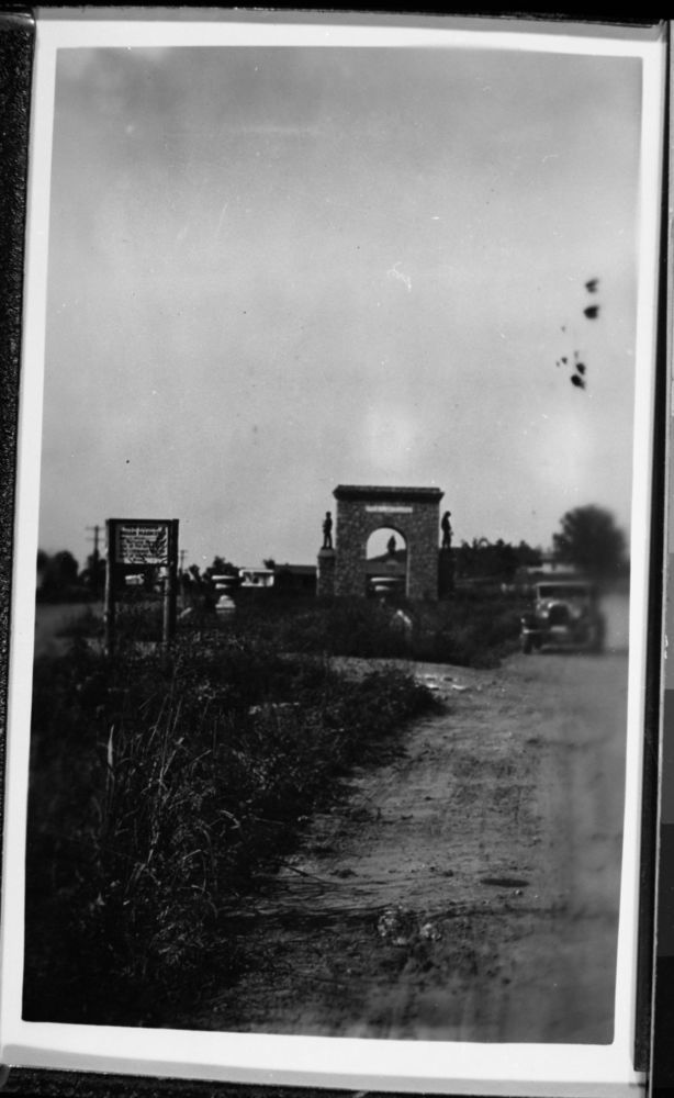 Camp, 340000, New Echota, Georgia, Historic Individuals, statue of Chief Sequoyah seen through arch for soldiers of Civil War and World War.