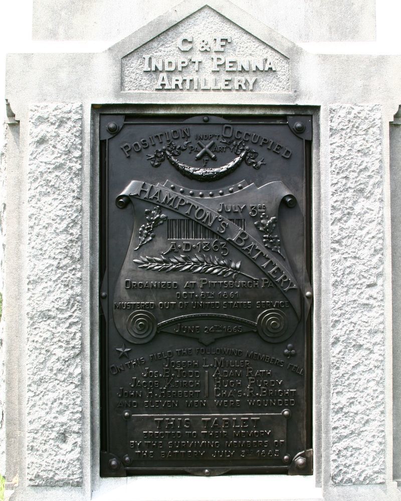 1 of 110 Monumnet to Pennsylvania. Indicates position held by Hampton's Battery C&F July 3, 1863 while repulsing Longstreet's assault. Located W side Hancock Avenue, 2 cannon w/monument. || Mn w/2 cannon. Base 4'10"x2'7" polished smooth cut. Shaft finish & rough cut, chamfered edges, bronze tablet obverse topped by excised inscription. 2 part cap w/hipped peak. Flanked by 2 cannon N-S of Mn.