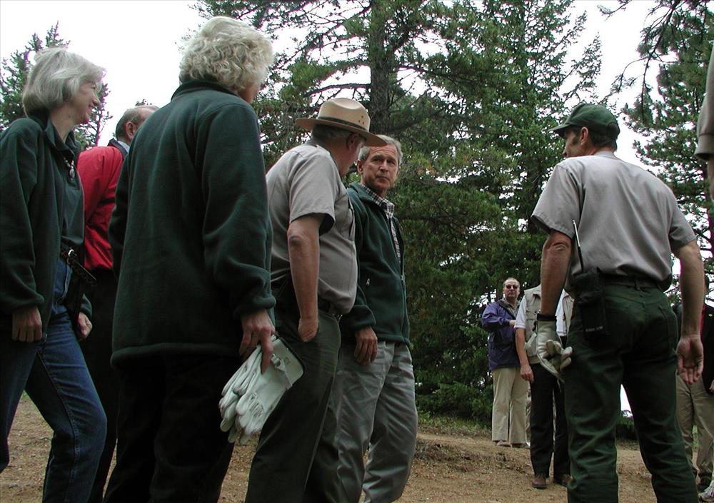 President Bush speaks with Secretary of Interior Norton, NPS Director Mainella, and Deputy Director Jones at Rocky Mountain National Park
