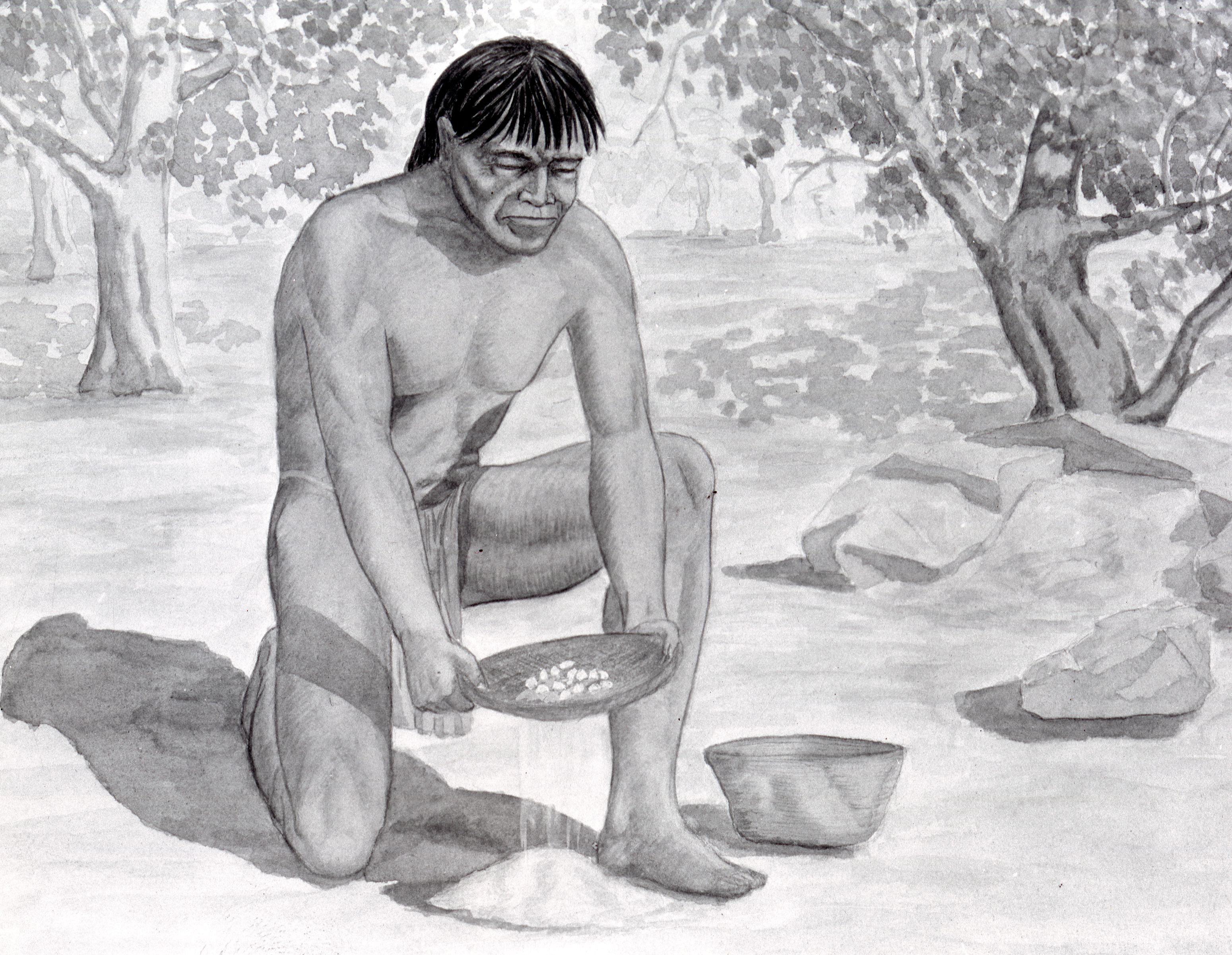 Grinding clambshells for Native American beads. Copy of drawing.