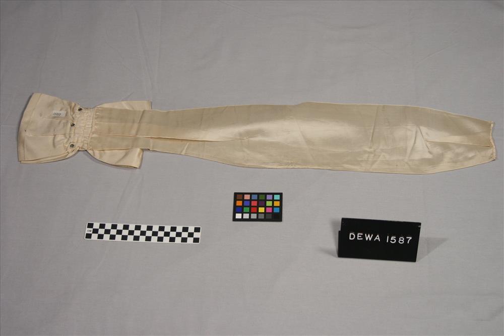 Ivory colored satin ribbon belt, closes with snaps, covered buckle with bow