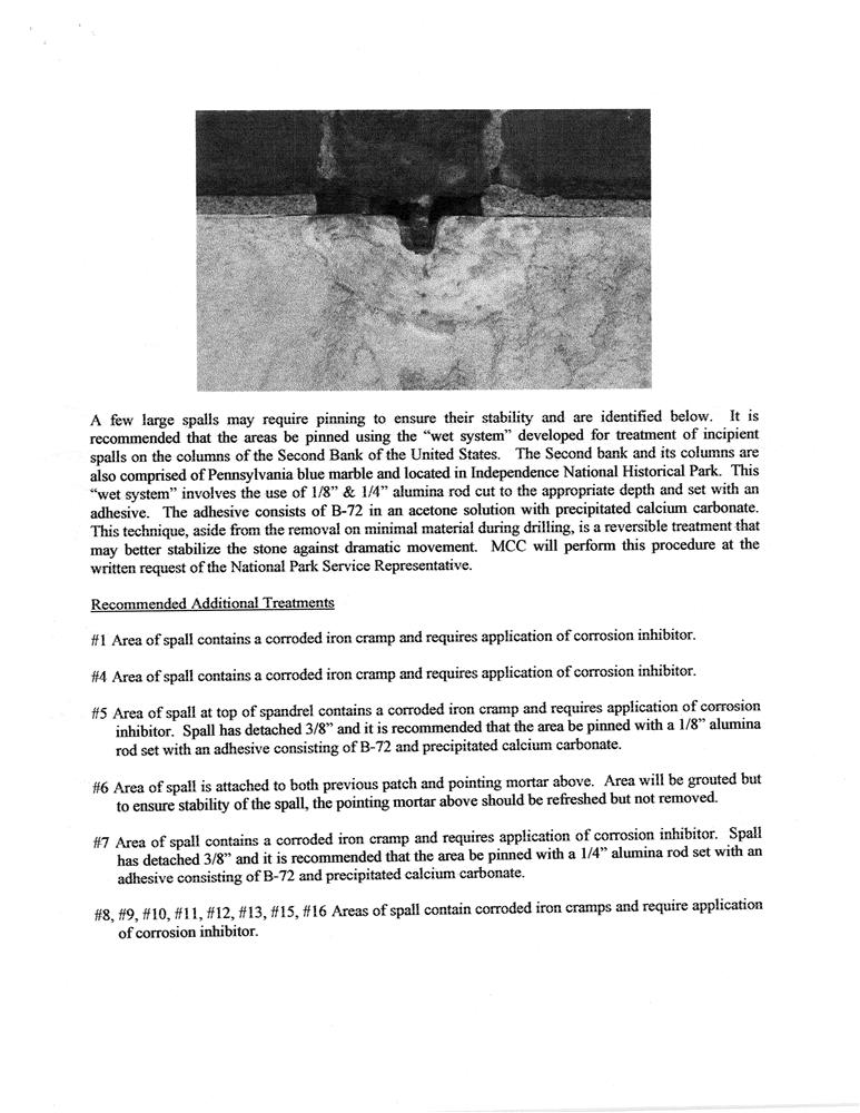 IN 2007, Milner Carr Conservation was hired to perform stone repairs on Independence Hall. As part of their contract, they also developed a report recommending additional treatments for the exterior Blue Marble Stone on Independence Hall's north elevation. This is a copy of that recommendation report.
