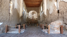 Interior of mission church nave with adobe walls, plaster, side altar remnants