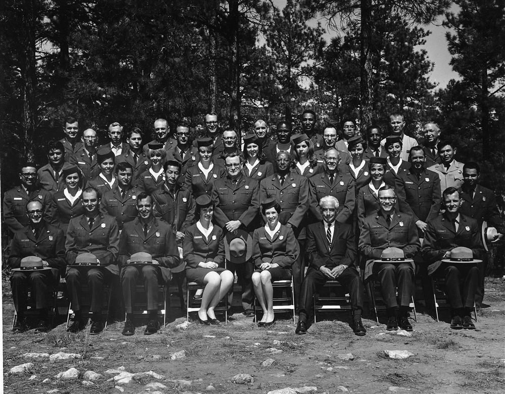 First row (l. to r.) Dwight L. Hamilton, TC staff; David B. Ames, TC staff; William N. Burgen, TC staff; Gail E. Hill, TC staff; Sydney M. Ruesch, TC staff; J. Carlisle Crouch; Wayne B. Cone, TC staff; Charles W. Wendt, TC staff. Second row (l. to r.) Alexander Garcia, Colonial; Ernestine V. Escalante, Tuzigoot; Noberto M. Ortega, Big Bend; Masanori G. Tanaka, City of Refuge; Gerald V. Sheerin, Cape Cod; Joseph P. Eaglin, National Capital Parks - Central; John P. Barnett, Shiloh; Ellen H. Lang, Sitka; Bobby L. Bowden, Chickamauga & Chattanooga; Jose E. Ramos, San Juan. Third row (l. to r.) Vernon Scott, Mescalero Apache Tribe; Madeline S. Billy, Saint-Gaudens; Linda S. Gruen, Los Angeles Field Office; Helen D. Lindsley, Yellowstone; Carmen A. Bush, Gettysburg; Elizabeth H. Knight, Grand Teton; Doris I. Omundson, Point Reyes; Carole T. Scanlon, Independence; Bob F. Curley, Navajo Parks & Recreation Department. Fourth row (l. to r.) Donald E. Borquist, Roosevelt-Vanderbilt; James L. Protto, Yellowstone; Paul R. Thompson, Petrified Forst; Ralph I. Evans, Canyon de Chelly; Edmond E. Roberts, Virgin Islands; Brantley W. Dickey, Petrified Forest; Eugene J. Colbert, National Capital Parks - Central; Billie Guedon, Natchez Trace. Fifth row (l. to r.) George Vasjuta, National Capital Parks - North; Ray D. Warren, Yosemite; Frank S. Miller, National Capital Parks - Central; Malcolm J. Berg, Yellowstone; Lewis A. Eaton, Fort Laramie; Edward B. Footmon, National Capital Parks - Central; Charles E. Castro, Sequoia; Leo J. Kangas, Wellfleet Job Corps Center.