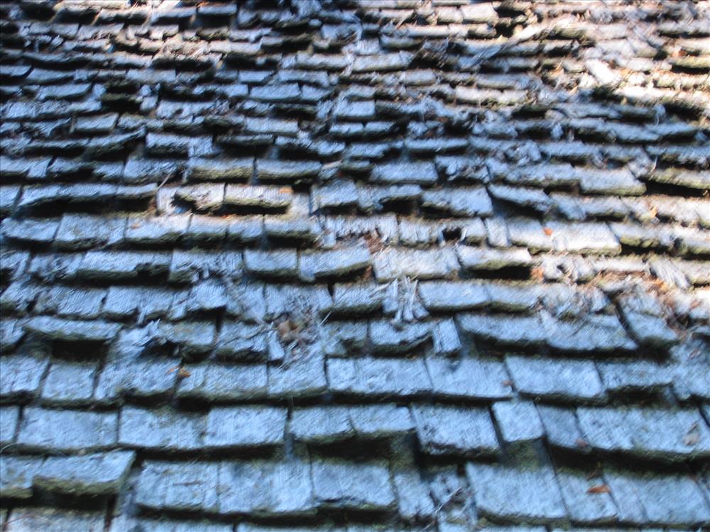 Walker Sisters Corn Crib located in Great Smoky Mountains National Park. The photograph is showing the condition of the roof and exterior of building. The condition of the building is fair and the roof is poor