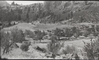 Black and white photograph of trees, large cleared areas, fences, and several partially hidden buildings under steep rocky cliffs.