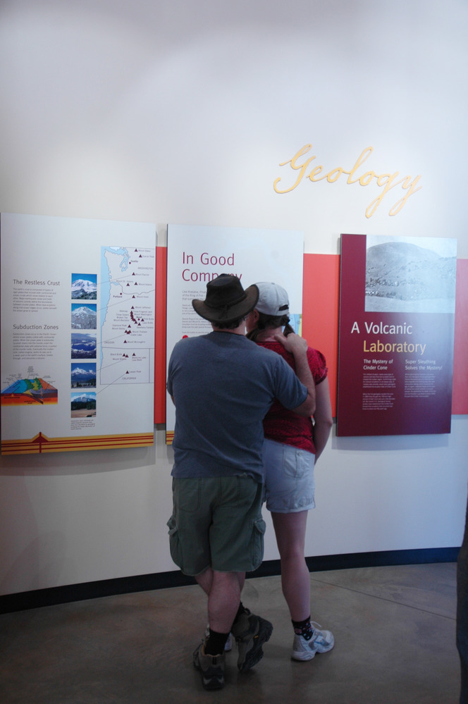Two people looking at an exhibit about geology inside the Kohm Yah-mah-nee Visitor Center.