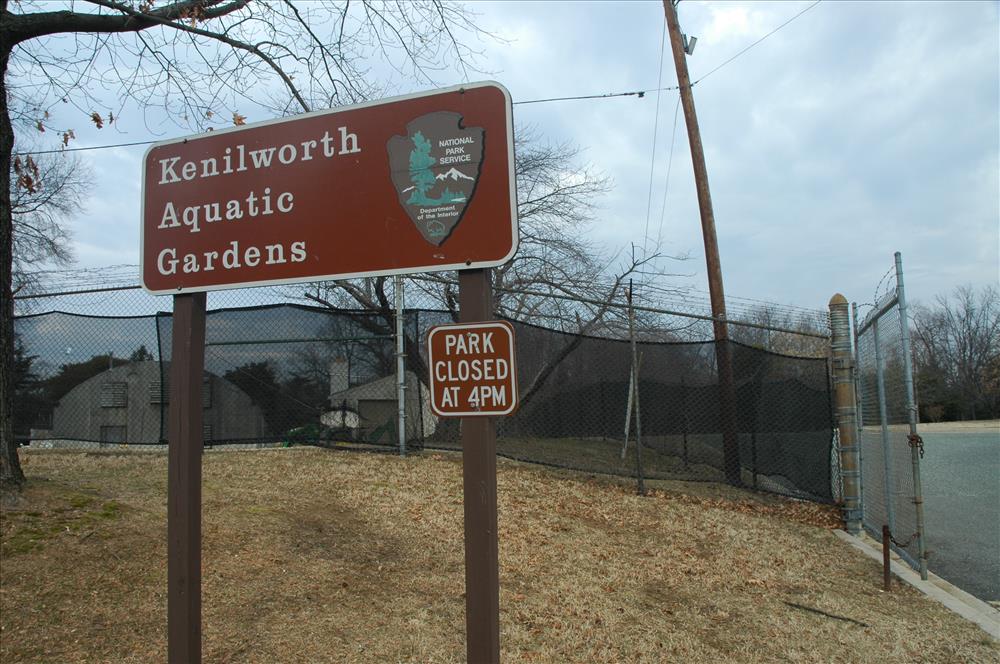 Existing entrance gate and security fencing for Kenilworth Aquatic Gardens.