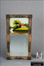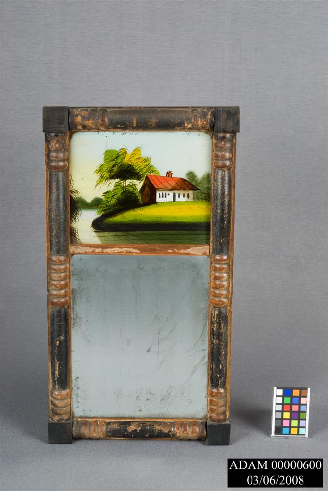 An American Empire, black-painted and parcel-gilt mirror, early 19th century, with eglomise transom reverse painted with a cottage by a stream.